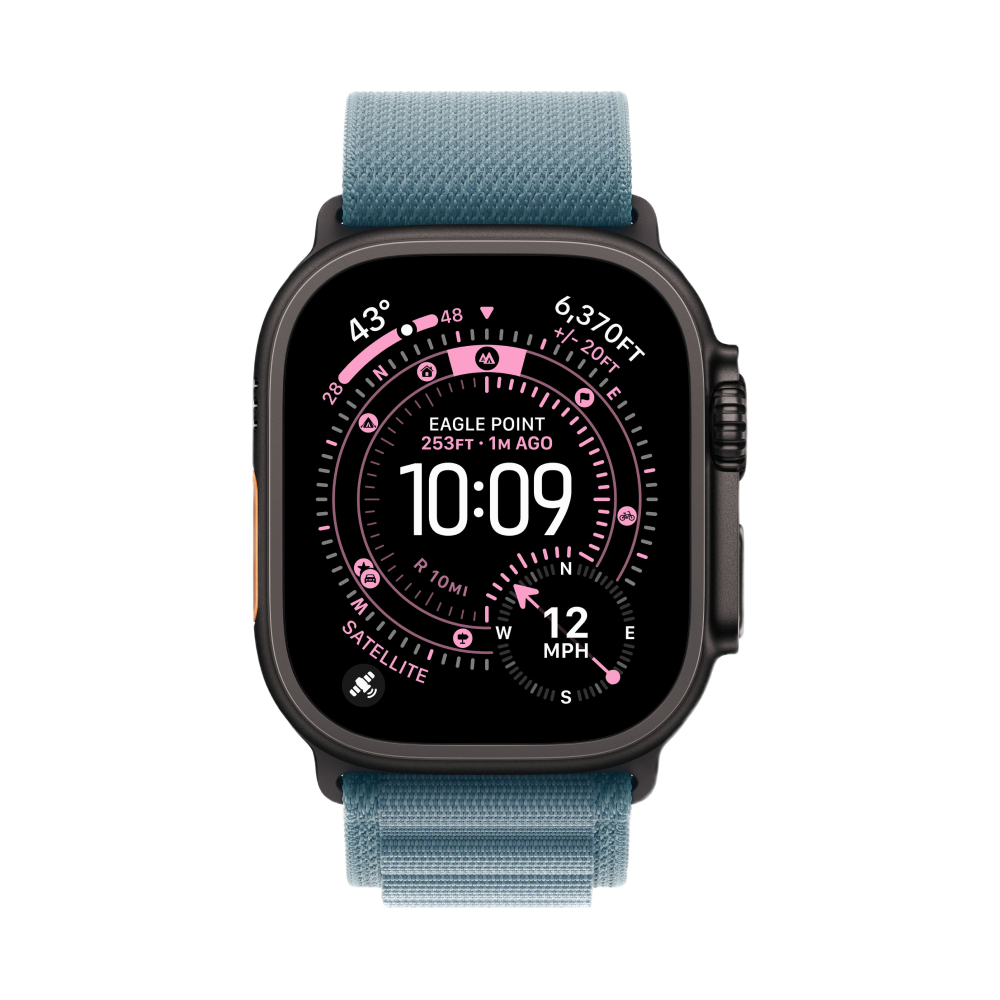 Apple Watch Ultra 3, 49 мм, корпус из титана цвета Чёрный (Black Titanium), ремешок Alpine, цвет светло синий, S
